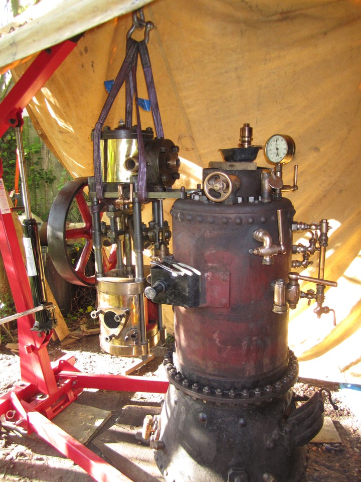 The engine going back onto the boiler. Note the pressure gauge. The boiler was full of water & pressed to 100 psi to check for leaks.