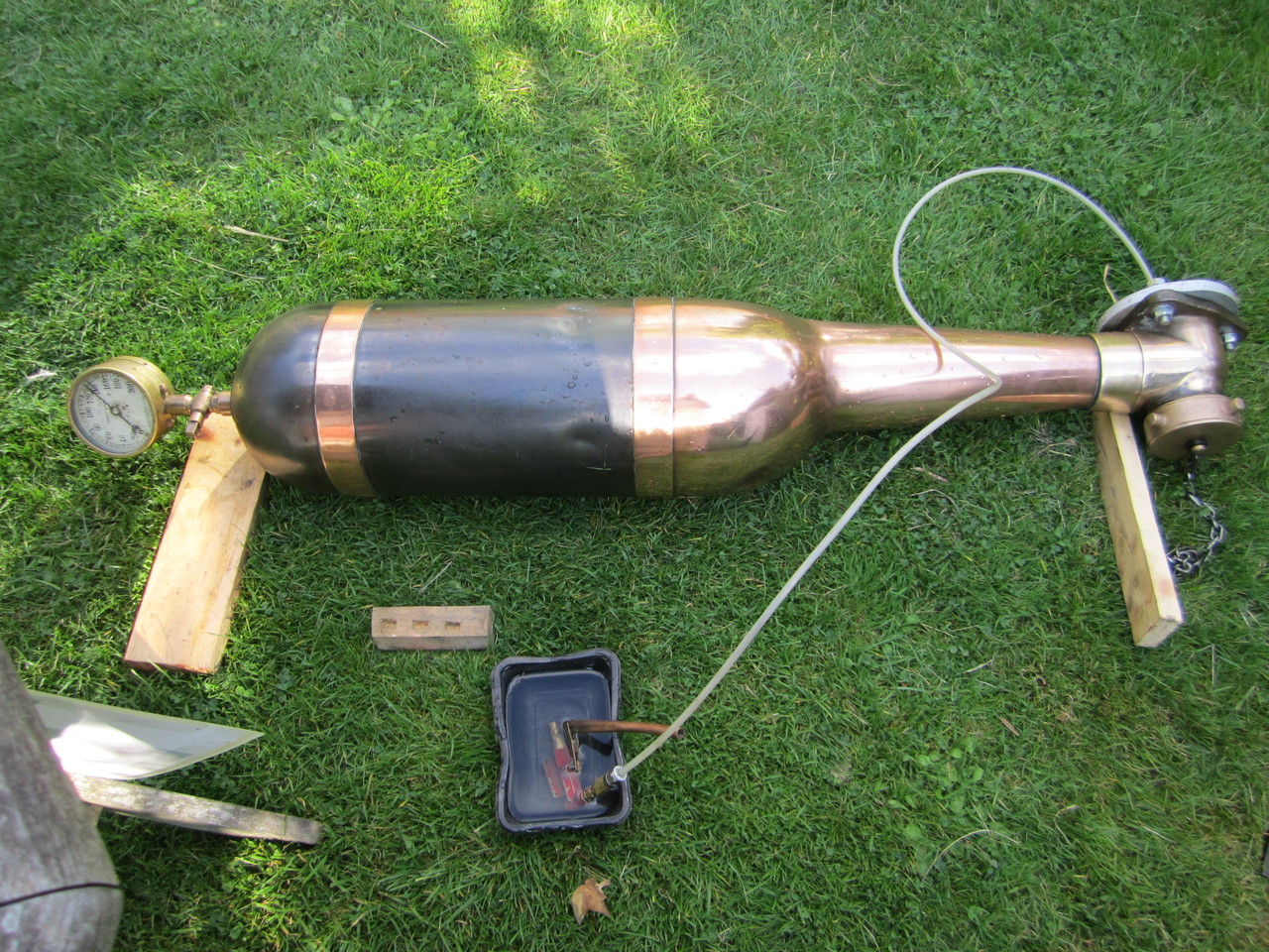 The air vessel shown here acts as a damper to the suppress the pulses from the pump. As the piston forces water out, air is compressed in this vessel & then, as the piston gets to the end of it's stroke, the compressed air pushes water out of the discharge connection. Here, the vessel is being pressure tested, full of water, at 120 psi, twice it's normal working pressure.